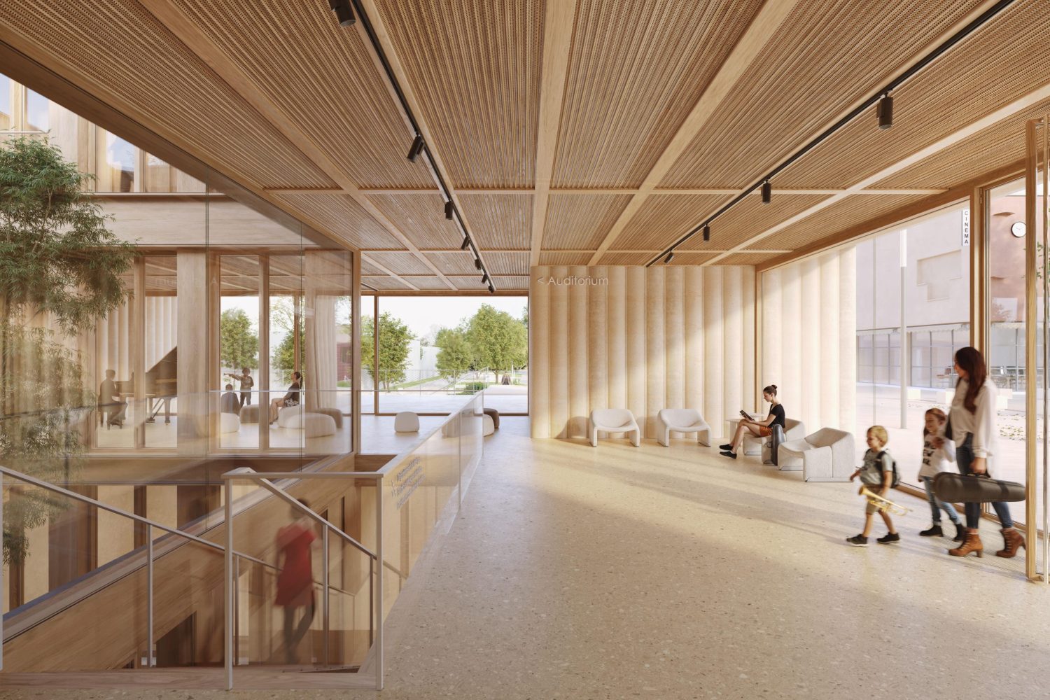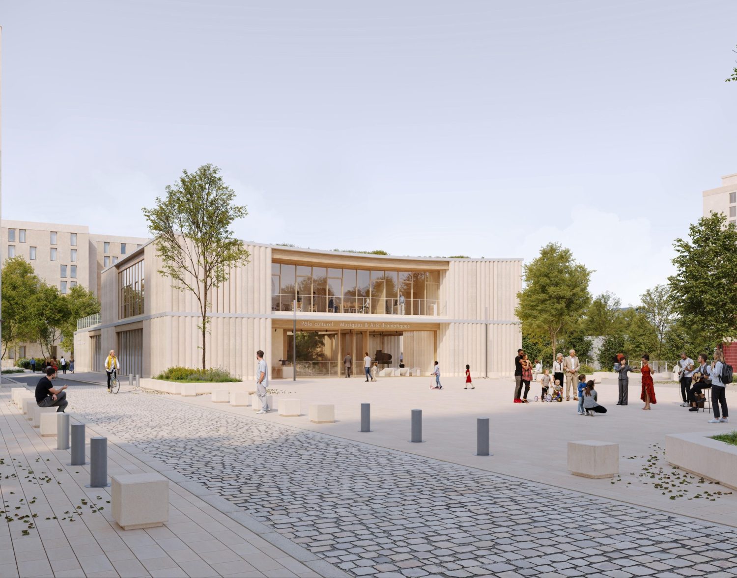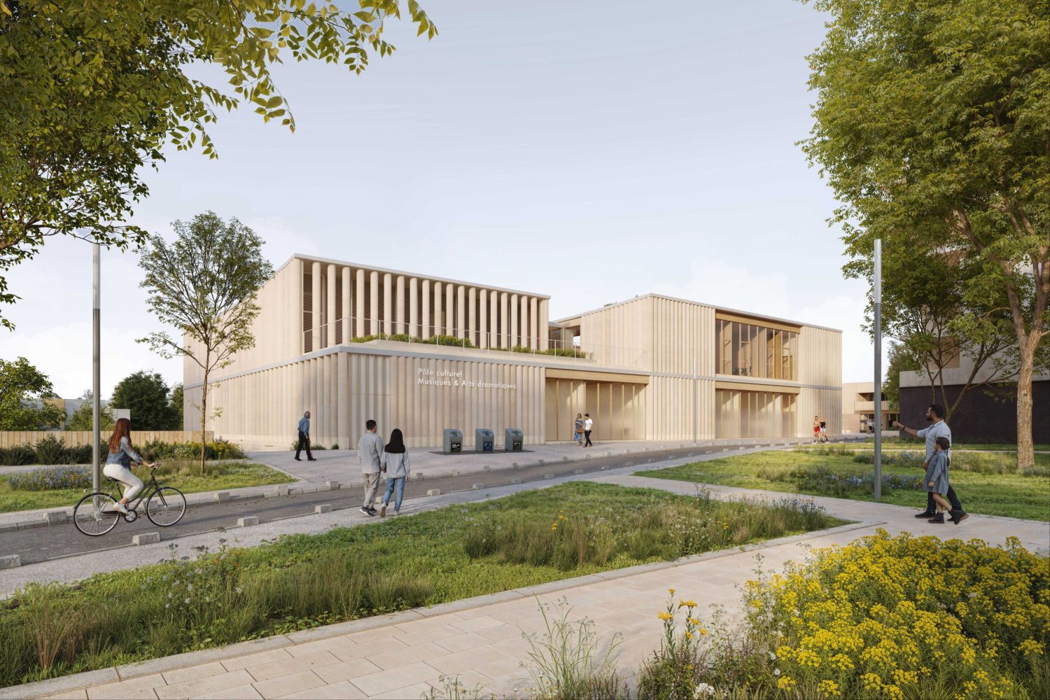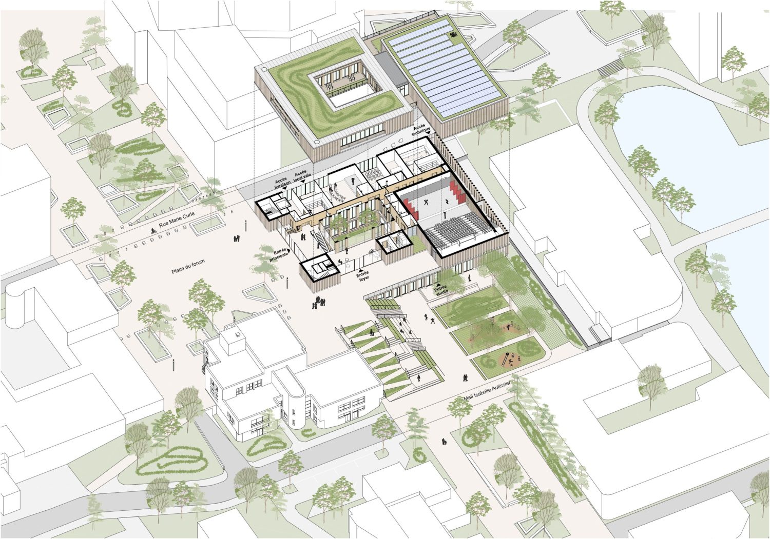 Le pôle culturel s’inscrit au cœur d’un quartier en pleine transformation, entre la ZAC de la Charmeraie au sud et la future ZAC de la Haie Griselle au nord. Le projet prend place dans un interstice stratégique, au contact de deux niveaux de ville distincts : d’un côté, la place du Forum, dans le prolongement de l’esplanade Joséphine Baker ; de l’autre, le futur mail Isabelle Autissier qui reliera l’équipement à l’un des étangs, pièce d’eau remarquable du quartier. Le bâtiment devient alors un élément de couture urbaine : son implantation répond à ces contraintes pour dessiner une continuité fluide entre les deux niveaux de ville, tout en conservant une empreinte au sol maîtrisée permettant de préserver une partie des arbres existants.