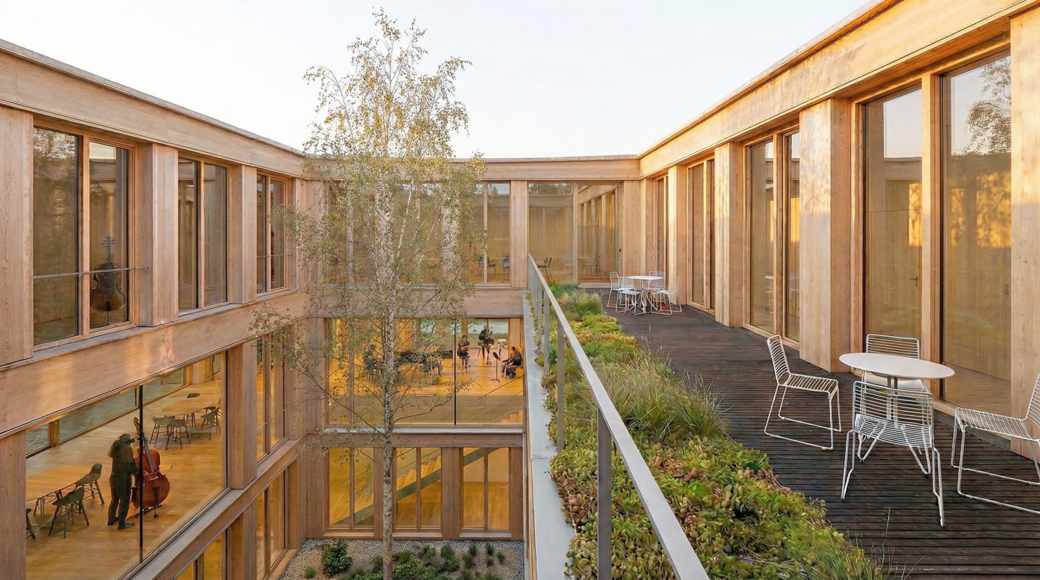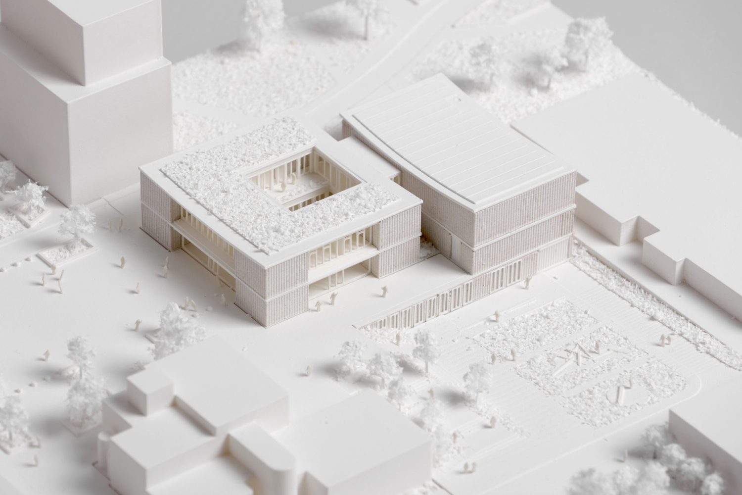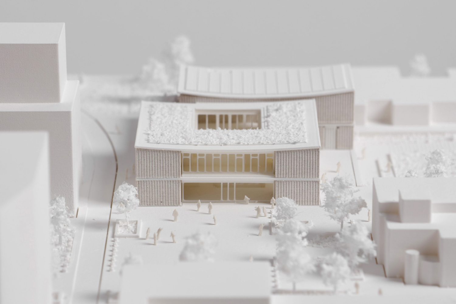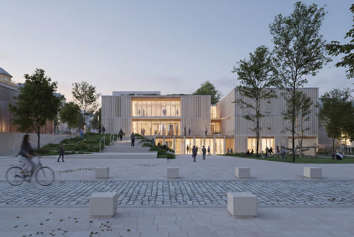 Le pôle culturel s’inscrit au cœur d’un quartier en pleine transformation, entre la ZAC de la Charmeraie au sud et la future ZAC de la Haie Griselle au nord. Le projet prend place dans un interstice stratégique, au contact de deux niveaux de ville distincts : d’un côté, la place du Forum, dans le prolongement de l’esplanade Joséphine Baker ; de l’autre, le futur mail Isabelle Autissier qui reliera l’équipement à l’un des étangs, pièce d’eau remarquable du quartier. Le bâtiment devient alors un élément de couture urbaine : son implantation répond à ces contraintes pour dessiner une continuité fluide entre les deux niveaux de ville, tout en conservant une empreinte au sol maîtrisée permettant de préserver une partie des arbres existants.